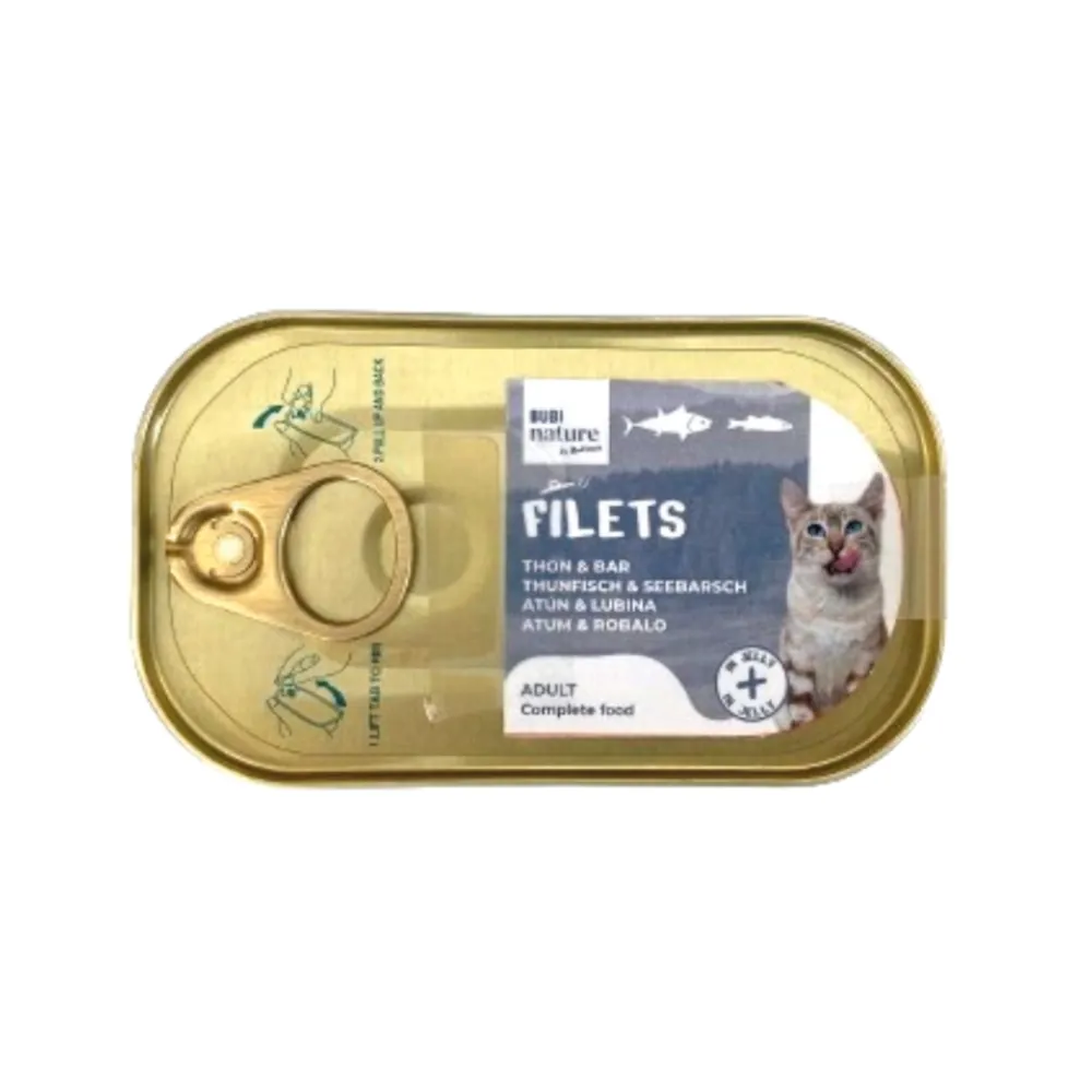 Bubimex Bubi Nature Filets Adult Complet Lata de Atún con Pollo y Lubina es un alimento húmedo completo para gatos adultos, elaborado con filetes de alta calidad que combinan atún (35%), pollo (4%) y lubina (4%), ofreciendo un sabor marino intenso y una nutrición equilibrada en cada comida.