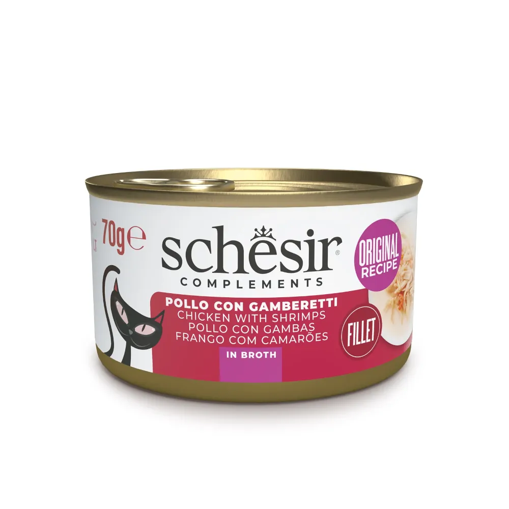 El Schesir Complements de Pollo con Gambas en Caldo es un alimento húmedo complementario en gelatina para gatos, elaborado con auténticos filetes de pollo de alta calidad combinados con gambas enteras, cocinados suavemente en un caldo natural y sabroso, que potencia el aroma y el sabor en cada bocado.
