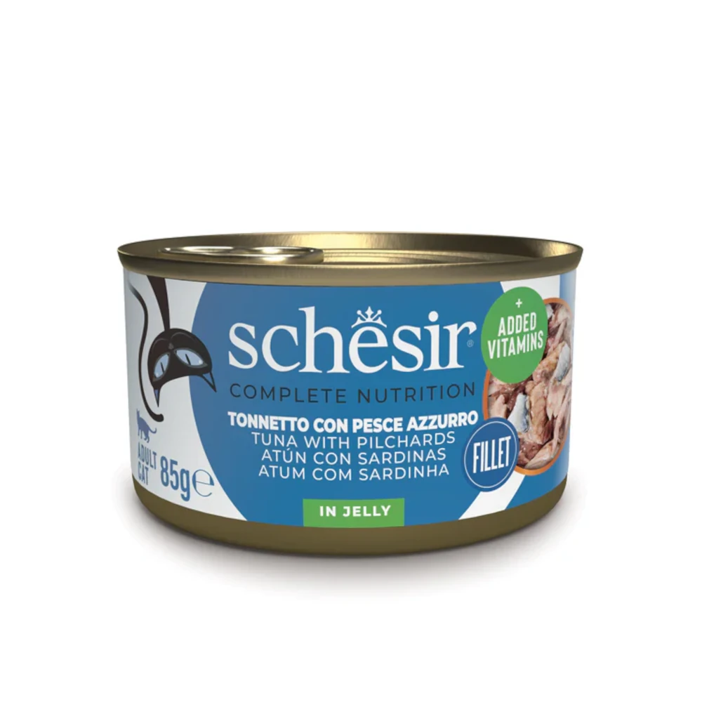 Schesir Complete Nutrition Atún con Sardinas en Gelatina es un alimento húmedo completo y equilibrado para gatos, elaborado con auténticos filetes de atún combinados con sardinas en una suave gelatina natural muy apetecible.