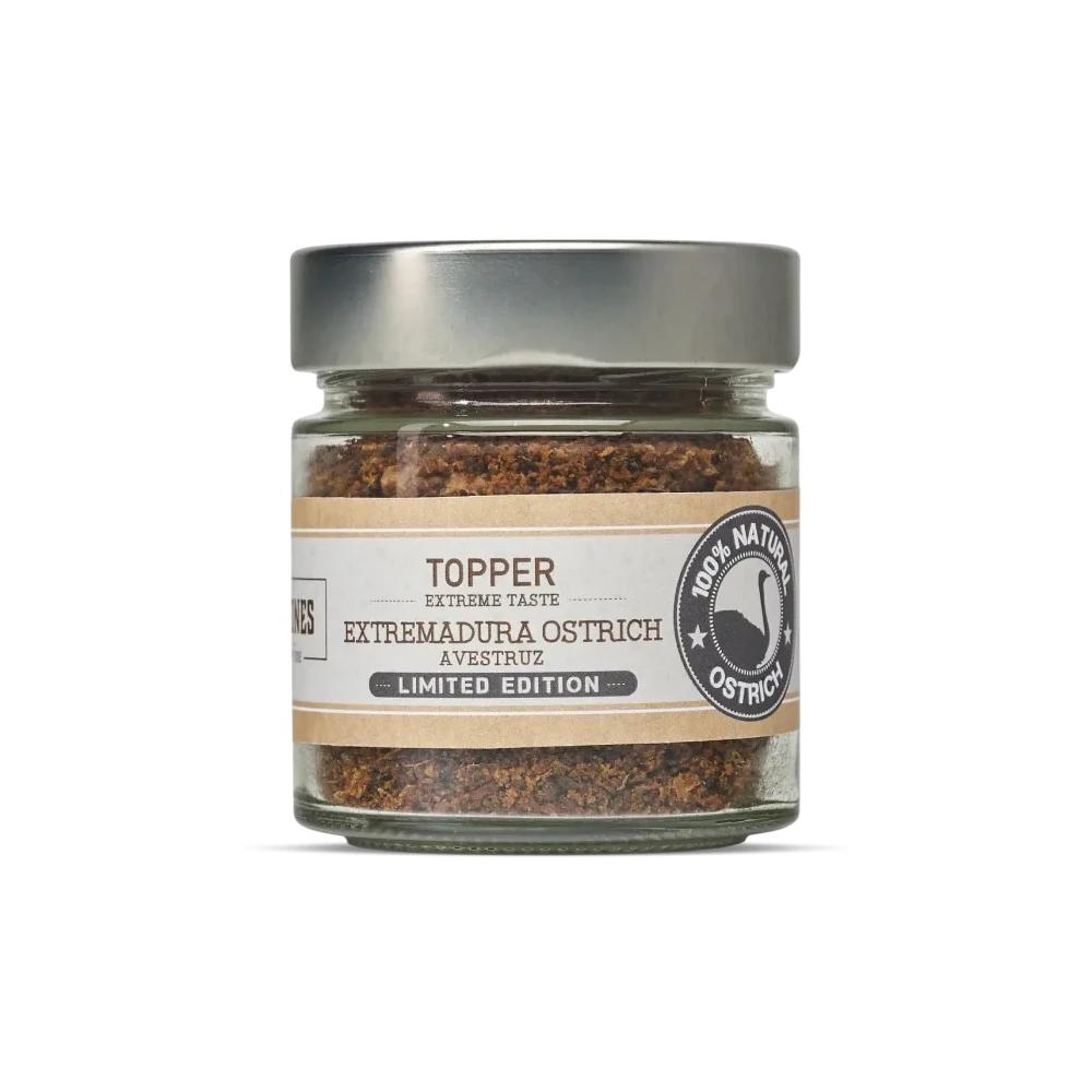 Complemento alimenticio elaborado con carne de avestruz criada en libertad en Extremadura. Rico en proteína de alta calidad y grasas saludables, transforma cualquier comida en un festín gourmet.