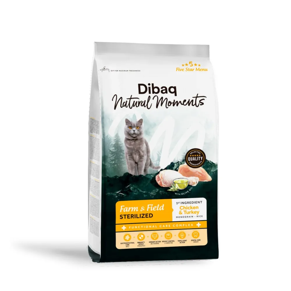 Dibaq Natural Moments Farm & Field Sterilized es un alimento completo y equilibrado para gatos adultos esterilizados con tendencia al sobrepeso. Tras la esterilización, el gasto energético disminuye, por lo que esta receta está diseñada para ayudar a mantener el peso ideal sin comprometer la calidad nutricional ni el sabor.