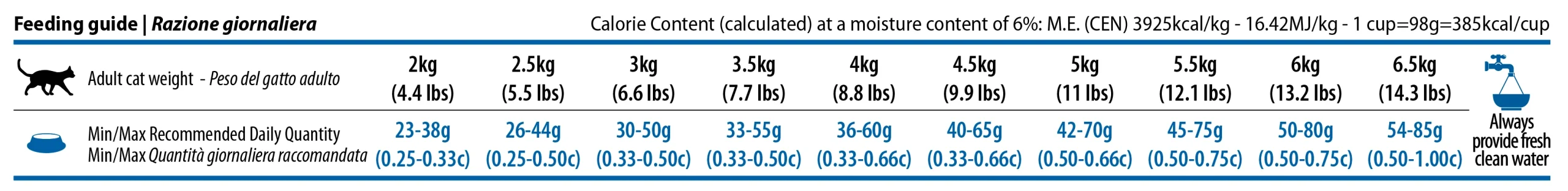 Las cantidades diarias recomendadas deben ajustarse en función del peso, edad, nivel de actividad y estado fisiológico del gato. Se recomienda introducir el alimento de forma gradual durante varios días.