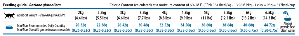 Las cantidades diarias recomendadas deben ajustarse en función del peso, edad, nivel de actividad y estado fisiológico del gato. Se recomienda introducir el alimento de forma gradual durante varios días.