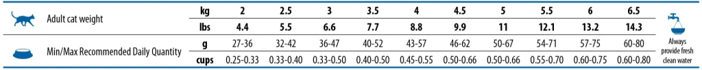 Las cantidades diarias recomendadas deben ajustarse en función del peso, edad, nivel de actividad y estado fisiológico del gato. Se recomienda introducir el alimento de forma gradual durante varios días.