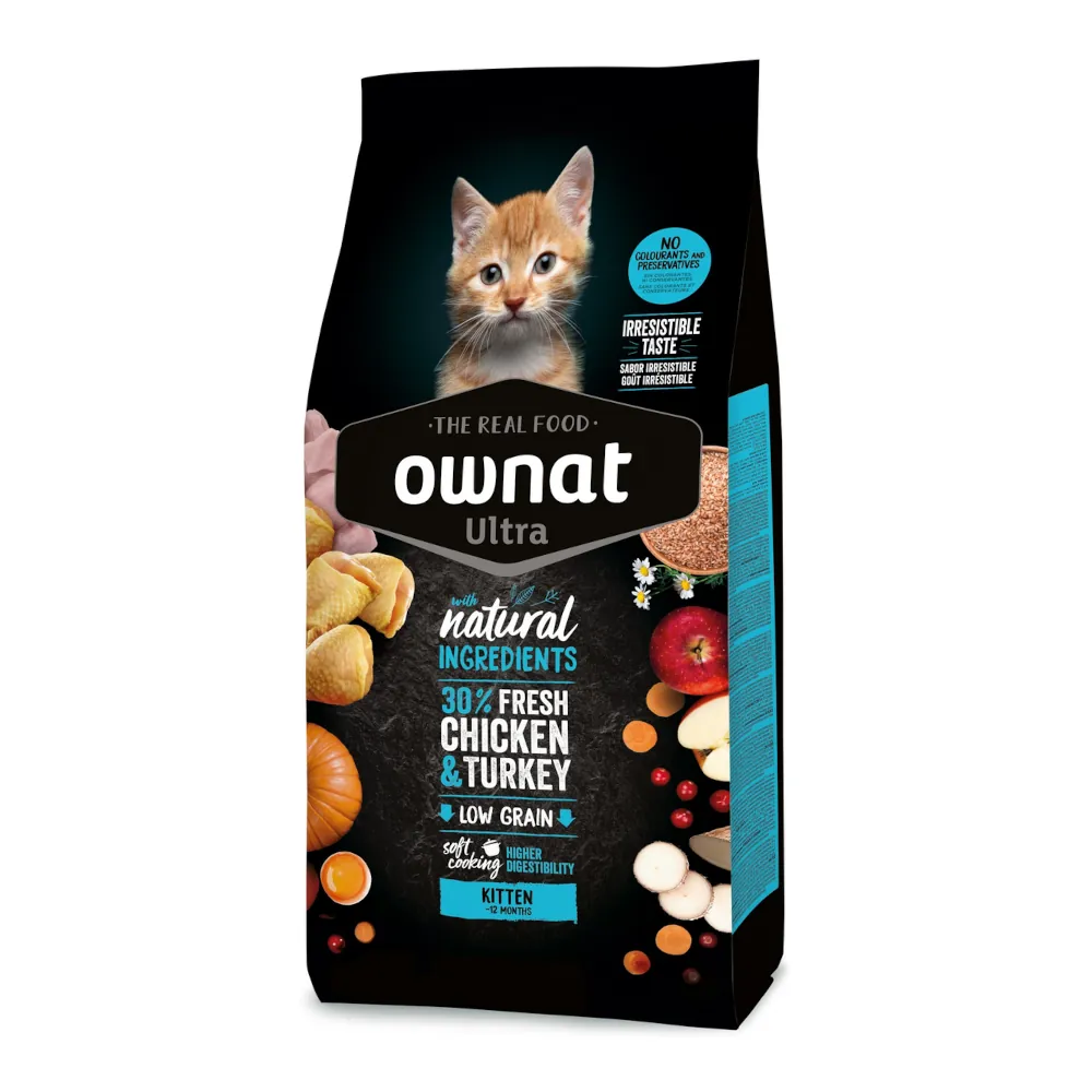 OWNAT Ultra Kitten es un alimento completo y equilibrado diseñado para gatitos de hasta 12 meses. Con 30 % de carne fresca de pollo y pavo, aporta proteínas de alta calidad para garantizar un crecimiento saludable y un desarrollo muscular óptimo.