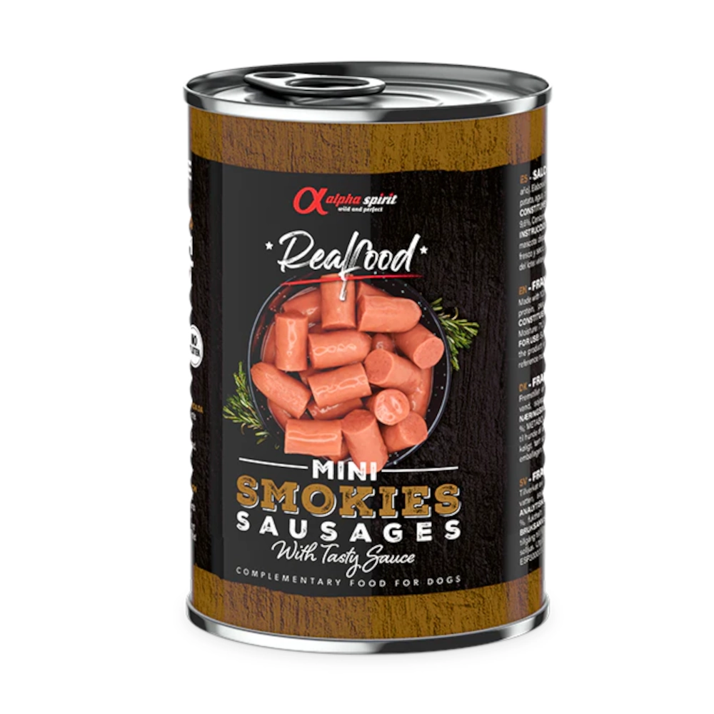 Alpha Spirit Realfood Mini Smokies Sausages with Tasty Sauce – Alimento complementario para perros (400g)
