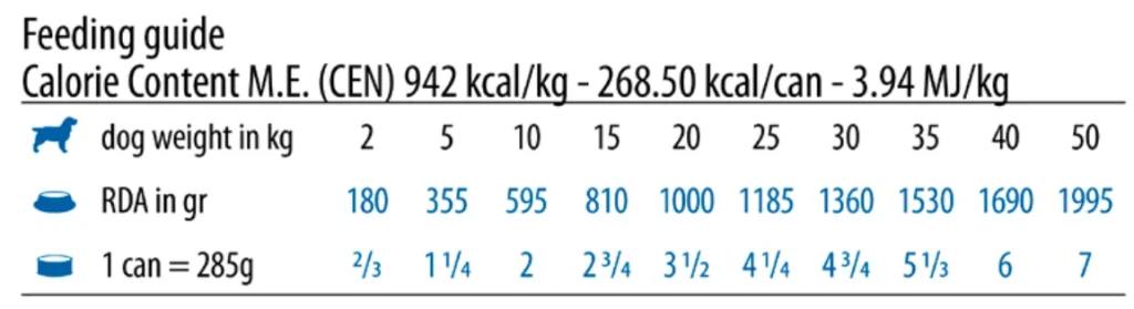 Las cantidades diarias recomendadas deben ajustarse en función del peso, edad, nivel de actividad y estado fisiológico del perro. Se recomienda introducir el alimento de forma gradual durante varios días.