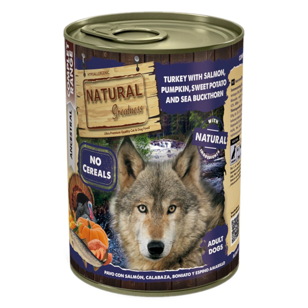 Natural Greatness Pavo con Salmón, Calabaza, Boniato y Espino Amarillo – Alimento húmedo completo para perros (400 g)