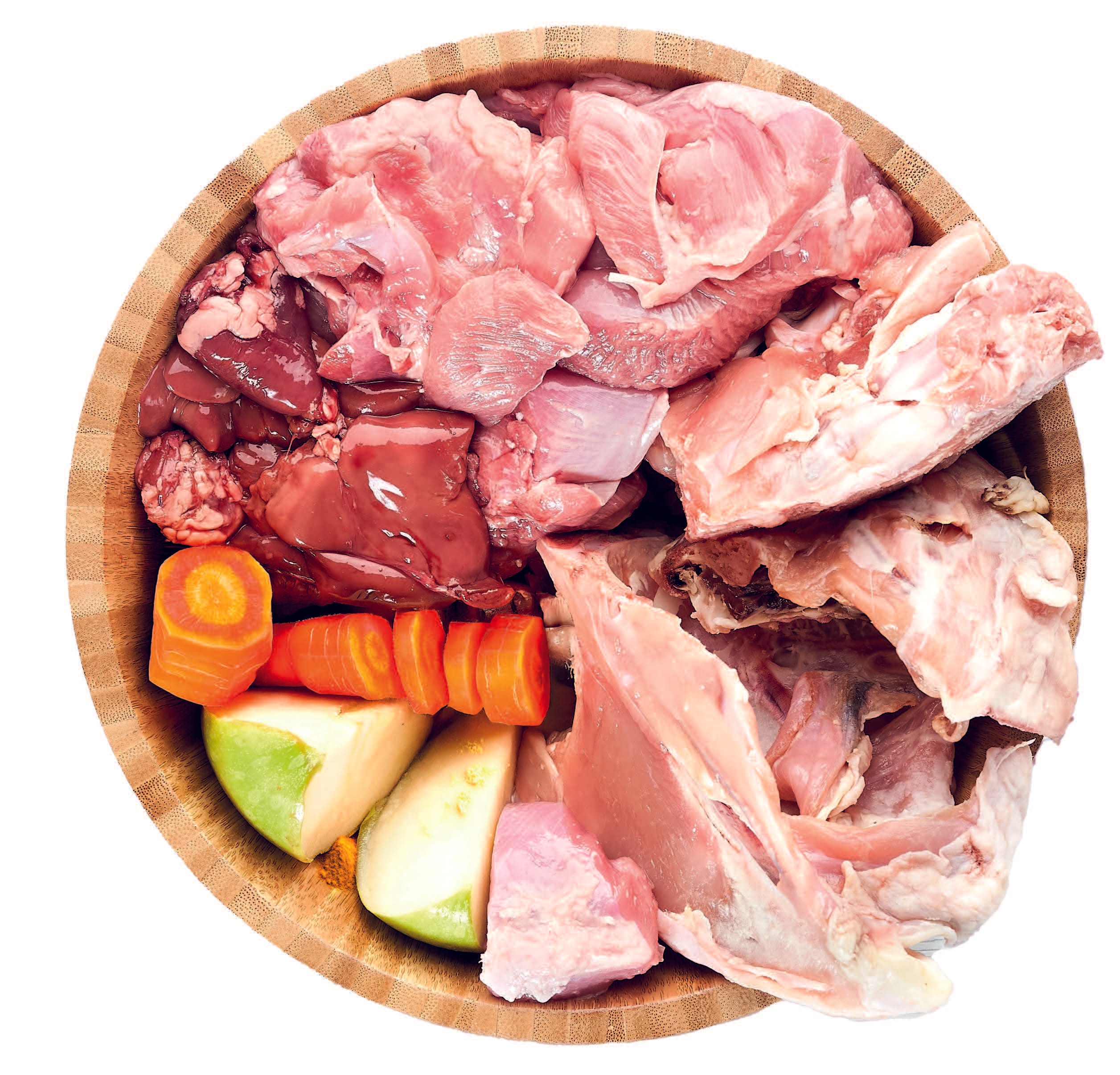 Magro de pollo (33%), carcasa molida (20%), corazón (15%), hígado (15%), calabaza (10%), manzana (5%), cúrcuma (1%) y orégano (1%).