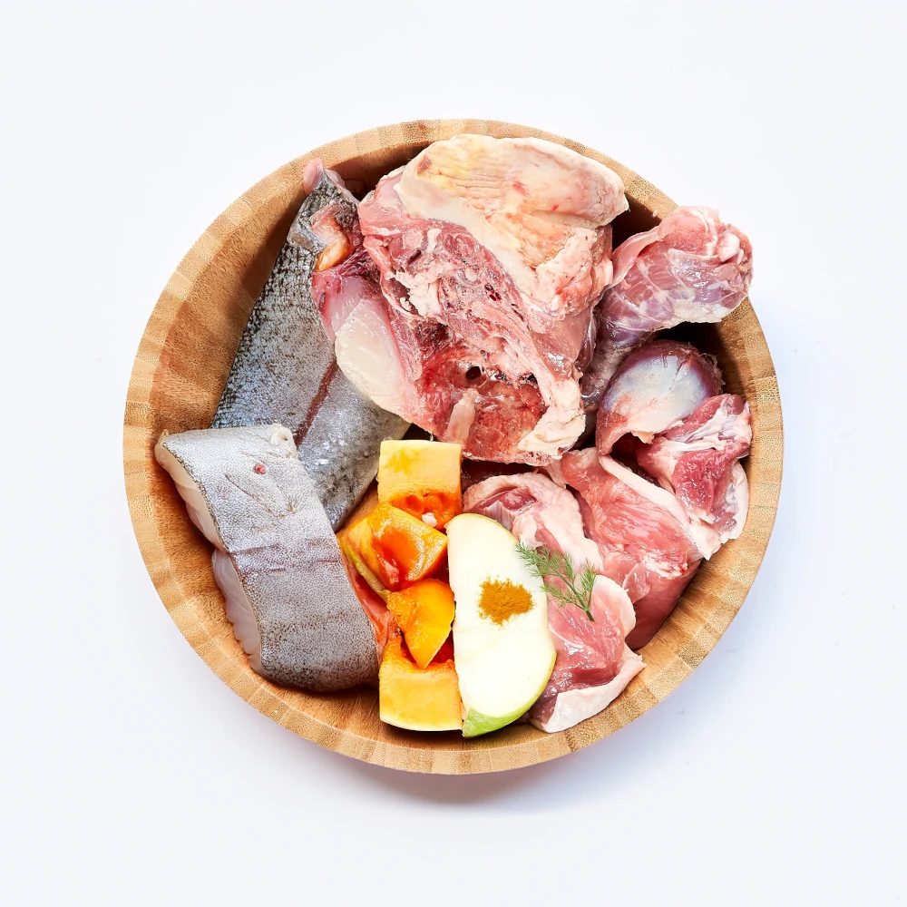 Una receta equilibrada, energética y muy sabrosa. Este menú BARF combina dos proteínas animales de alta calidad: el cordero, con un perfil graso funcional y rico sabor; y el pollo, más ligero y digestivo. Juntas forman una fórmula ideal para perros activos o con mayores necesidades calóricas.
