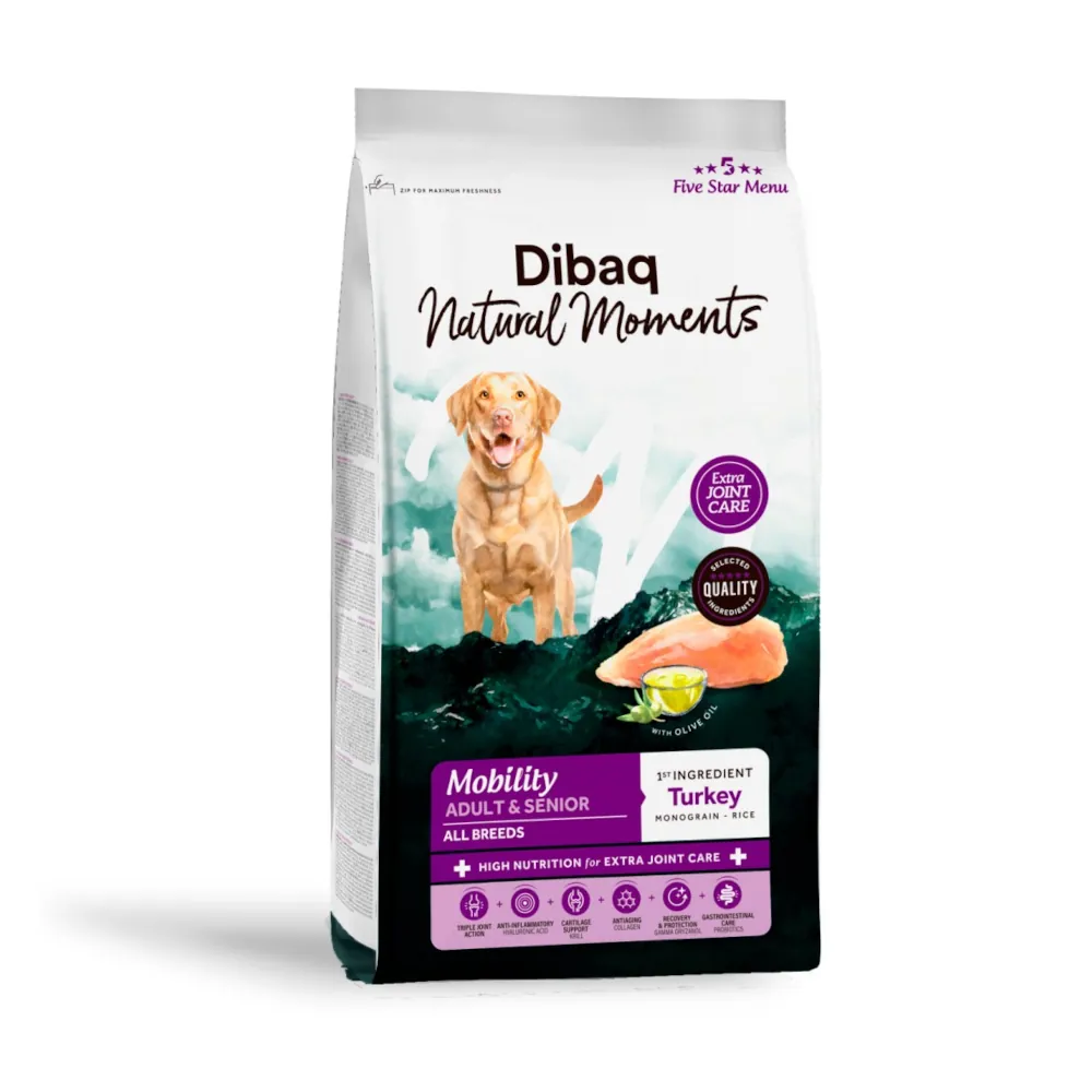 Dibaq Natural Moments Dog Mobility es un pienso natural y funcional especialmente formulado para perros adultos y senior (a partir de 7 años) con problemas articulares o que necesitan un cuidado preventivo de sus articulaciones.