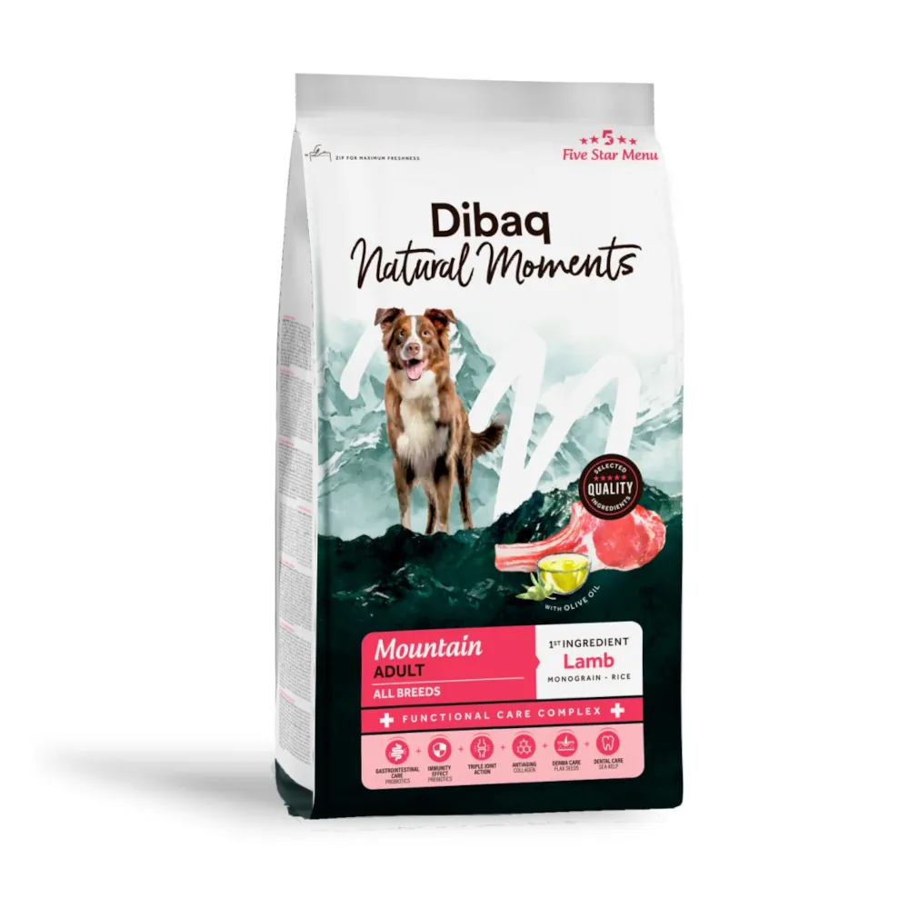 Dibaq Natural Moments Dog Mountain es un pienso natural completo para perros adultos de todas las razas, ideal para quienes buscan una alimentación funcional basada en ingredientes naturales y altamente digestivos.
