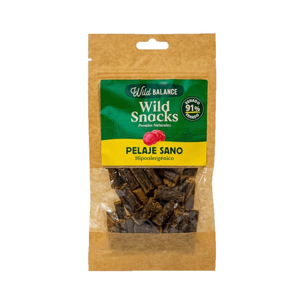 Los Wild Balance Wild Snacks Pelaje Sano Hipoalergénico son premios naturales elaborados con 91 % de carne de venado, una proteína magra, hipoalergénica y de alta digestibilidad. Gracias a la incorporación de lecitina de girasol, este snack contribuye al cuidado de la piel y al brillo del pelaje, siendo ideal para perros con piel sensible o propensos a alergias alimentarias.